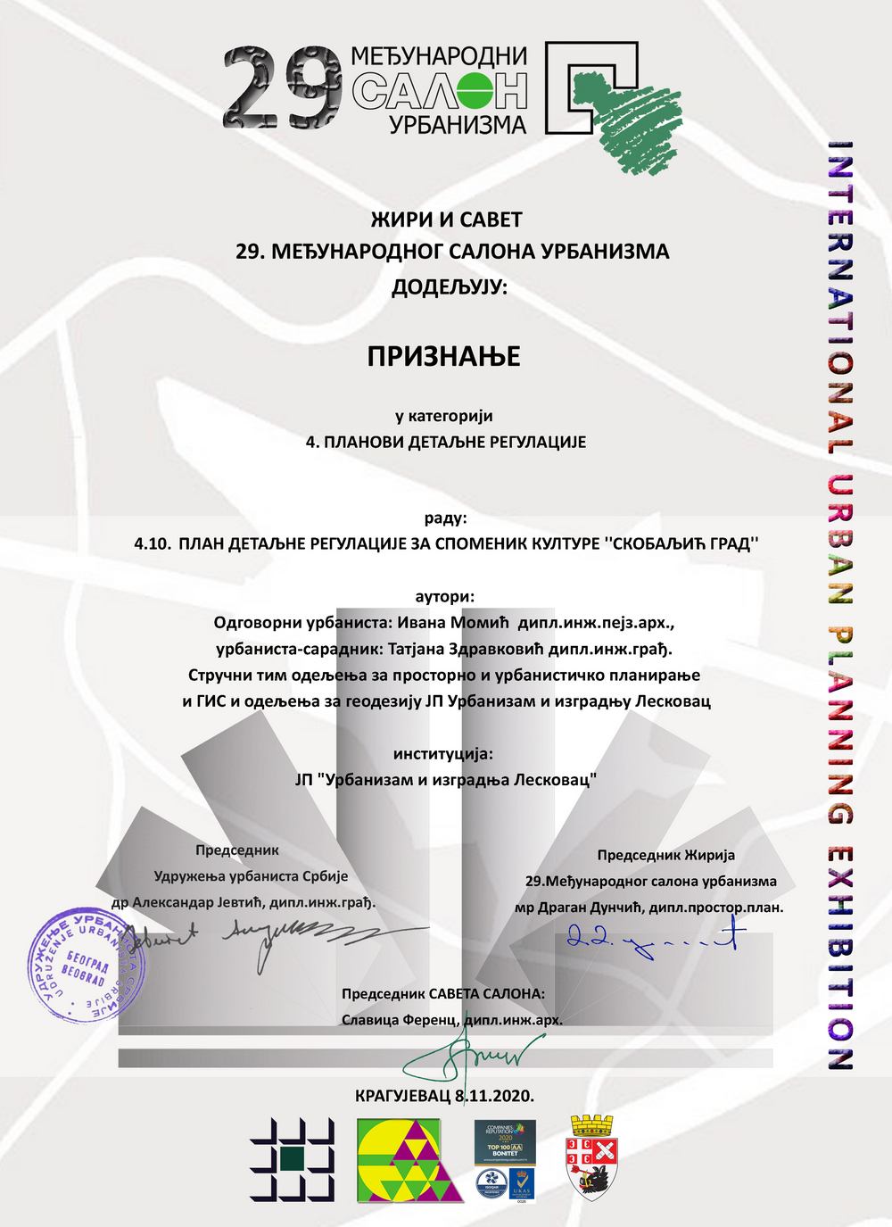 Na 29. Međunarodnom Salonu urbanizma koji se održao u Kragujevcu od 10. do 13. novembra 2020. godine., JP Urbanizam i izgradnja Leskovac osvojila je priznanje u kategoriji planovi detaljne regulacije.